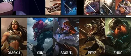 JDG选用:Xiaoxu鳄鱼;Xun巨魔;Scout阿萝拉;Peyz希维尔;Zhuo泰坦